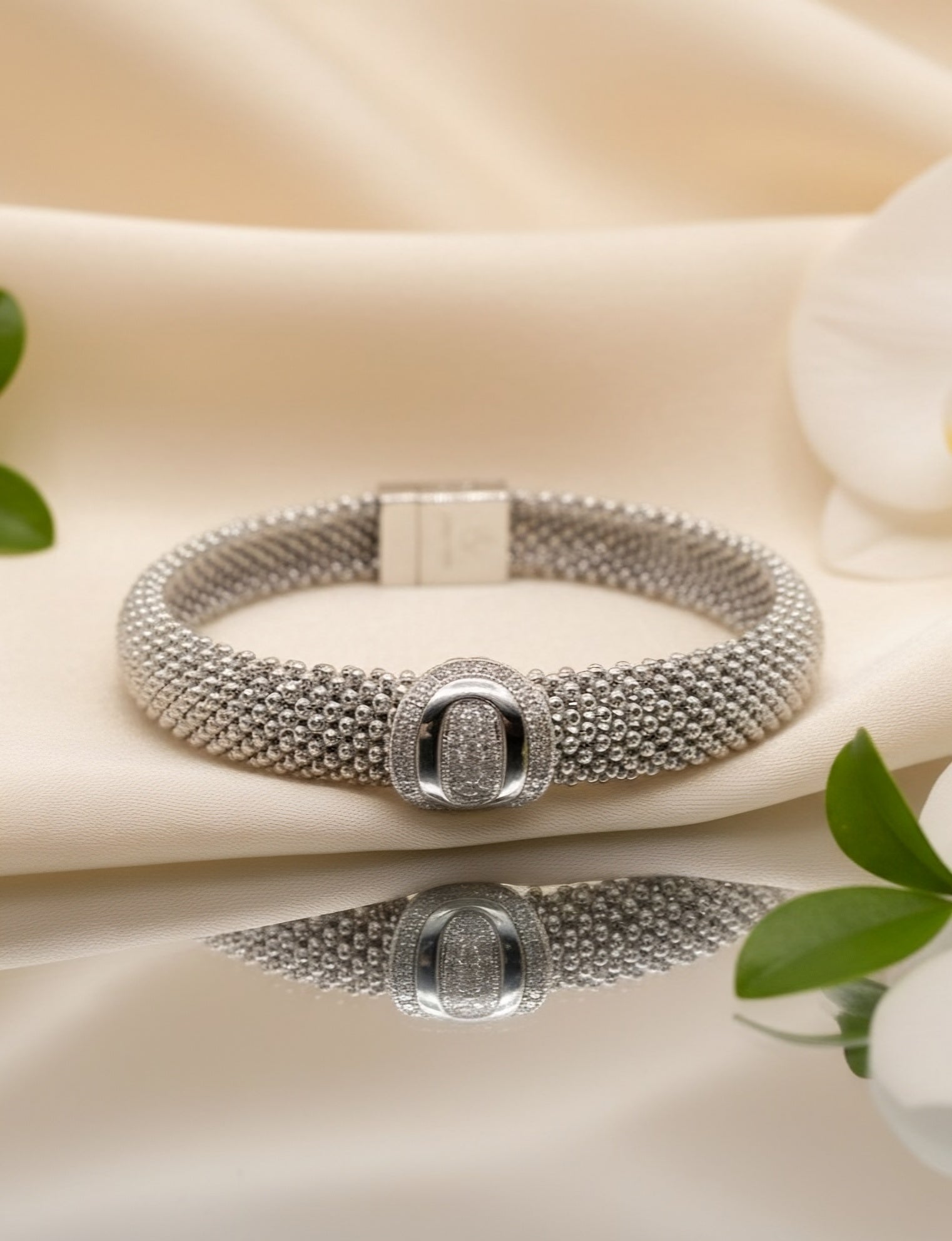 Silken Radiance სამაჯური სილამაზისა და ორიგინალურობის შერწყმის უნიკალური მაგალითია. დამზადებულია უმაღლესი ხარისხის 925 სინჯის ვერცხლისგან და დაფარულია როდიუმის საფარით, რაც უზრუნველყოფს ხანგრძლივ ბრწყინვალებას და გამძლეობას. მბზინავი ცირკონის ქვებით გაფორმებული ეს სამაჯური გამოირჩევა ელეგანტურობით და იდეალური აქსესუარია ნებისმიერი შემთხვევისთვის. მისი დახვეწილი მაგნიტური ჩამკეტი სამაჯურს კიდევ უფრო ორიგინალურს ხდის.
